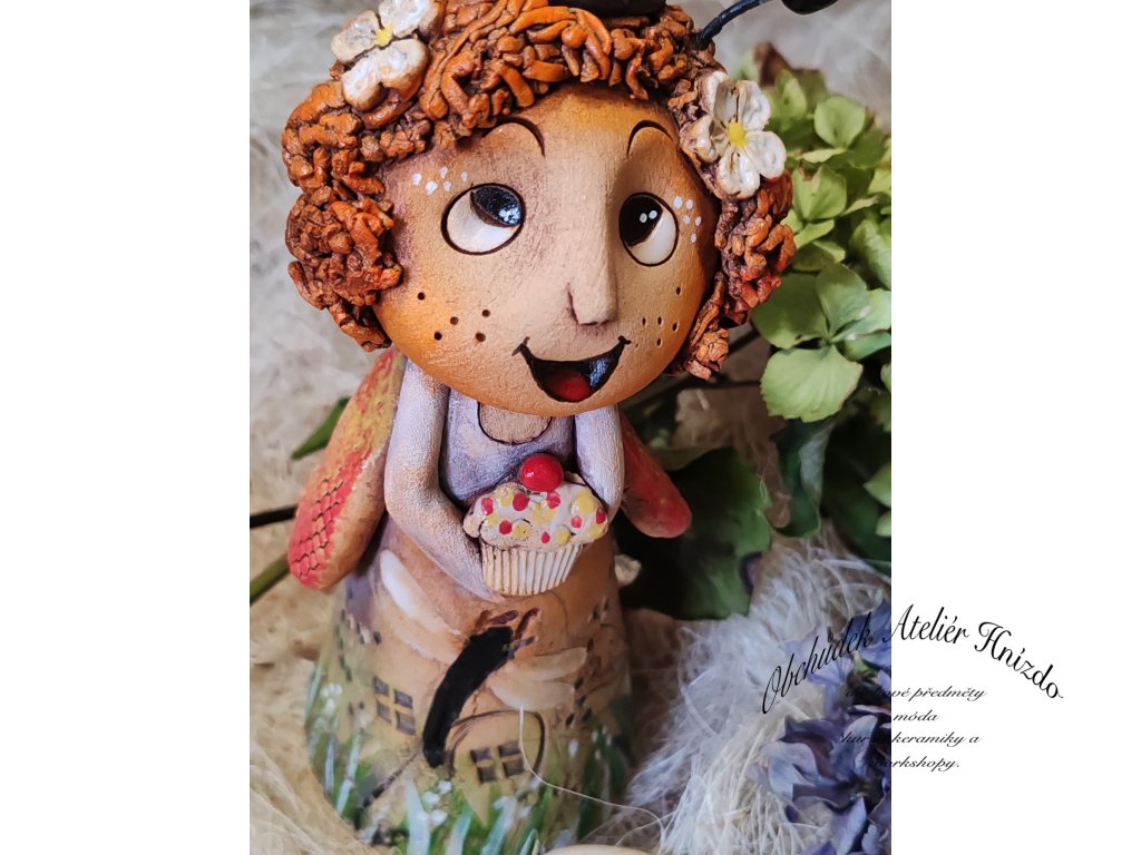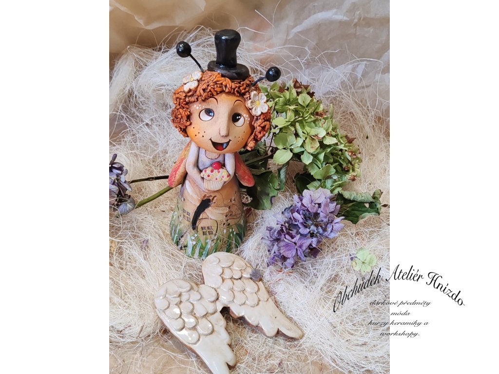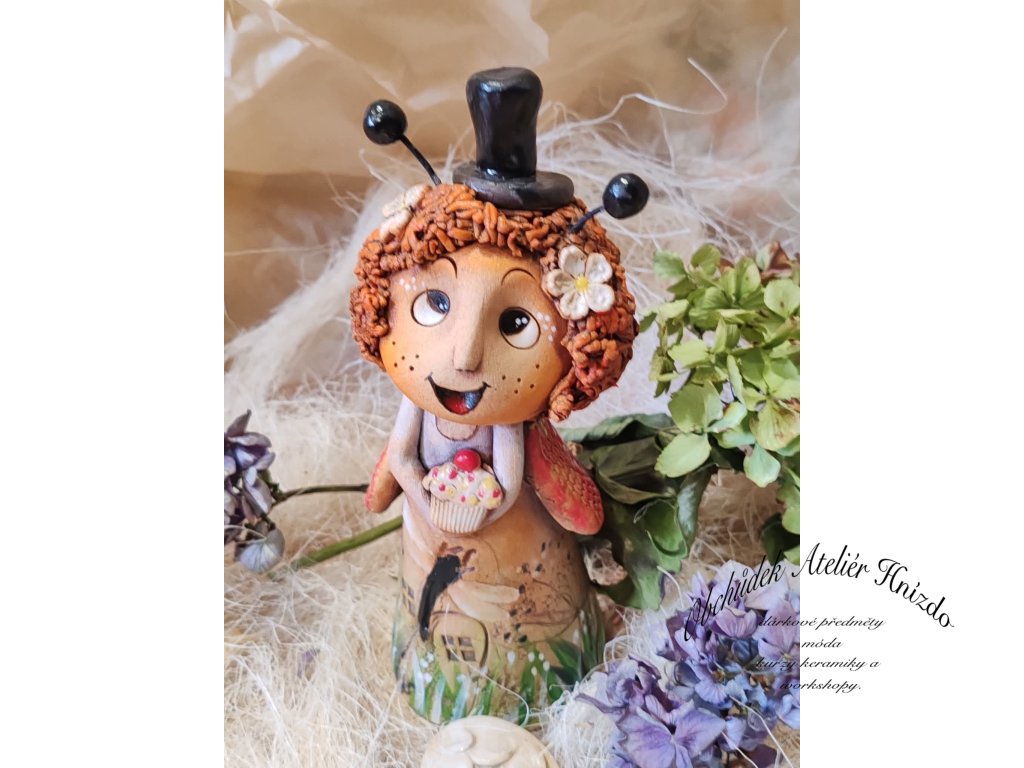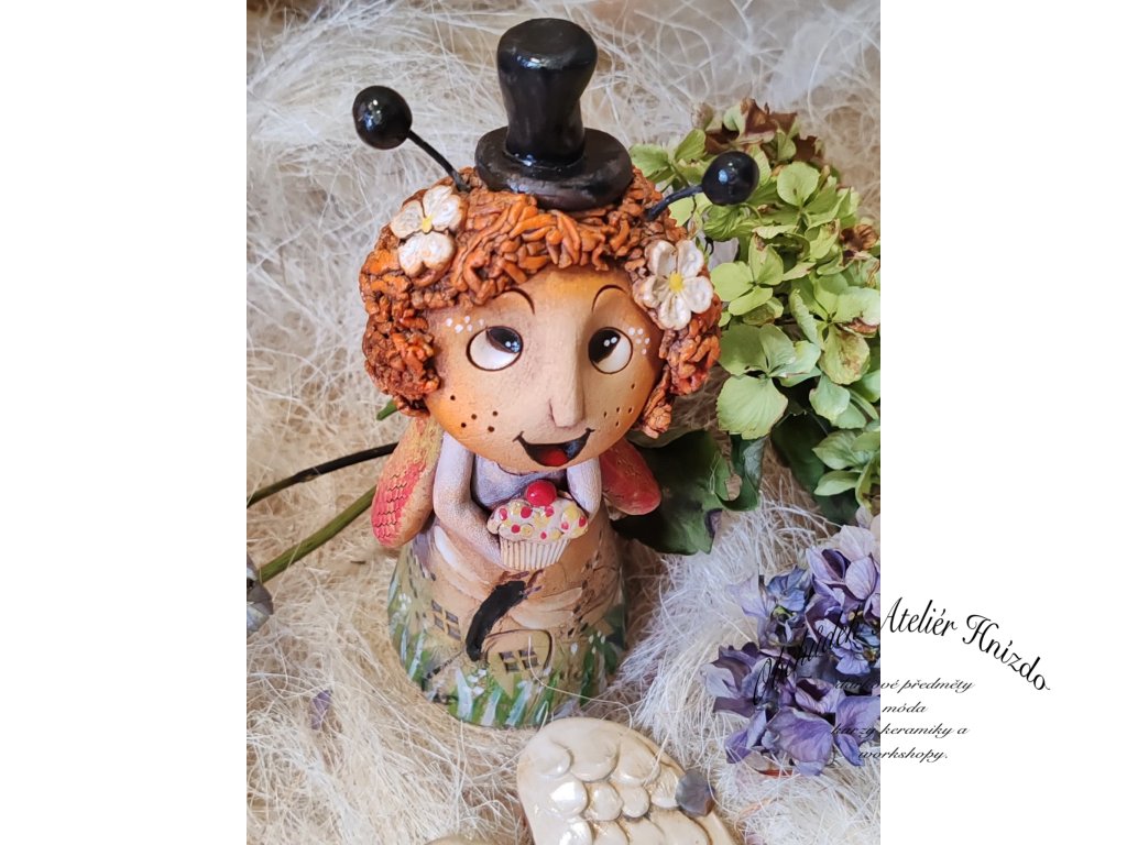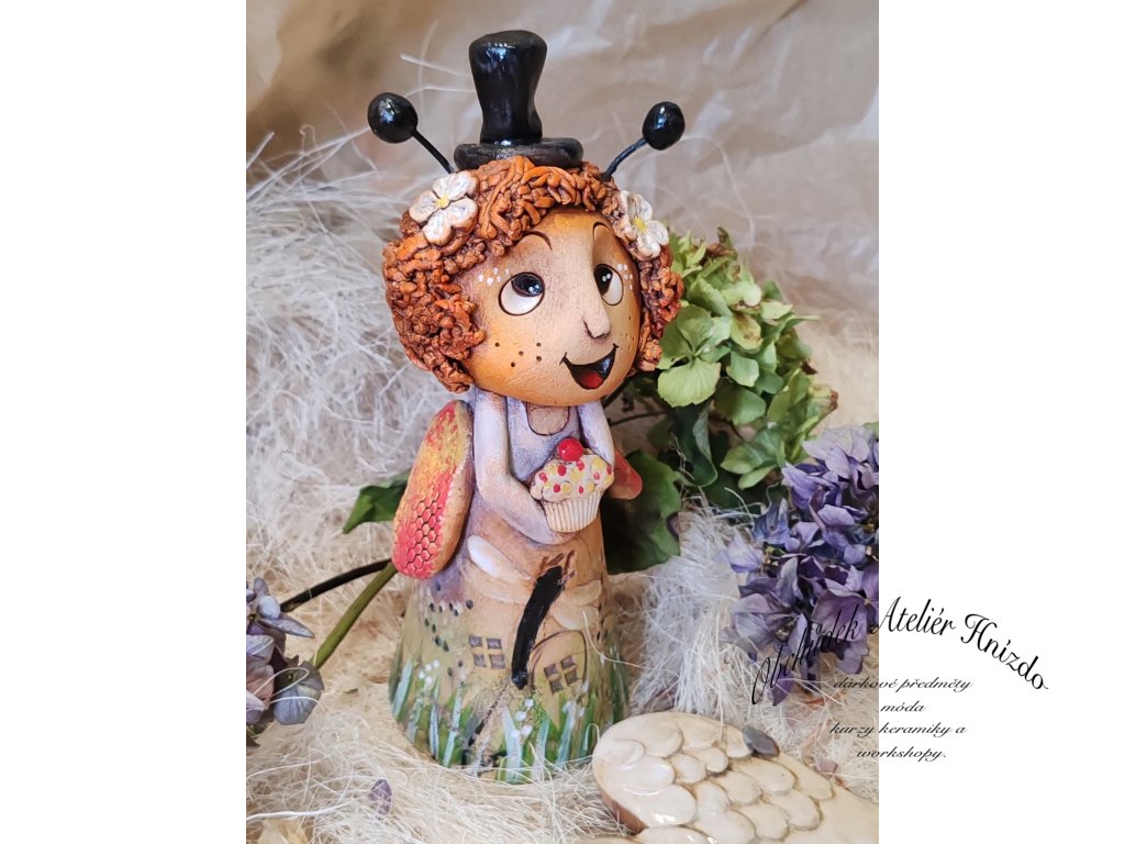 Figurka má černý klobouček s tykadélky, kudrnaté vlásky ozdobené kytičkami a výrazné červené krovky. Na šatech jsou ručně malované luční motivy s vážkami, travinami a drobnými domečky, což jí dodává pohádkový nádech. V rukou drží barevný cupcake, který podtrhuje veselý charakter celého zvonečku.