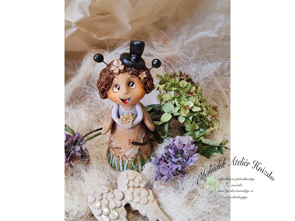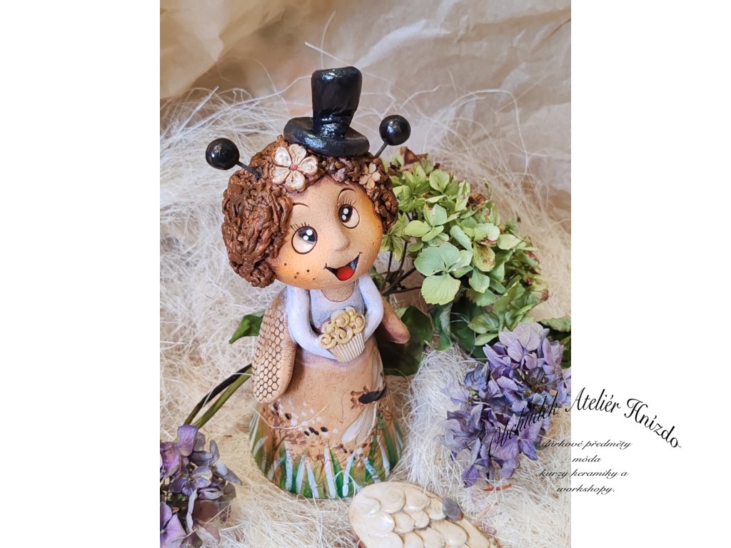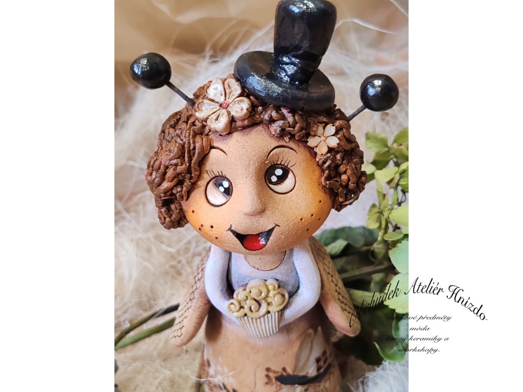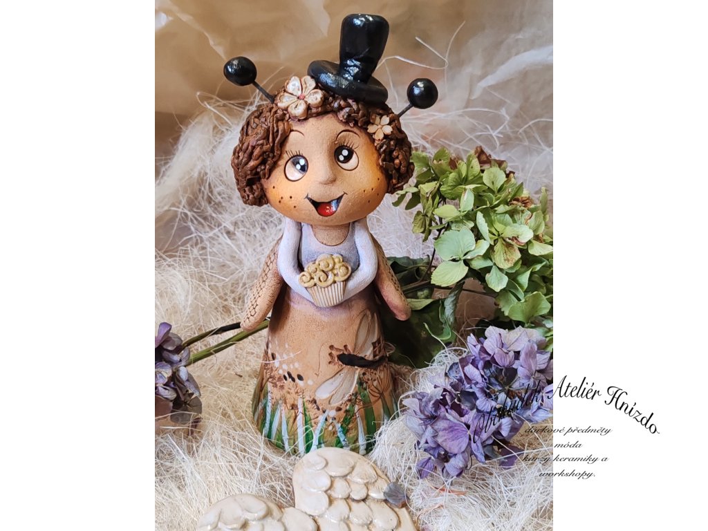 Figurka má klobouček s tykadélky, kudrnaté vlásky zdobené kytičkami a na šatech malované luční motivy s vážkami a travinami. V rukou drží malý zlatý cupcake, který podtrhuje hravý charakter celého zvonečku.