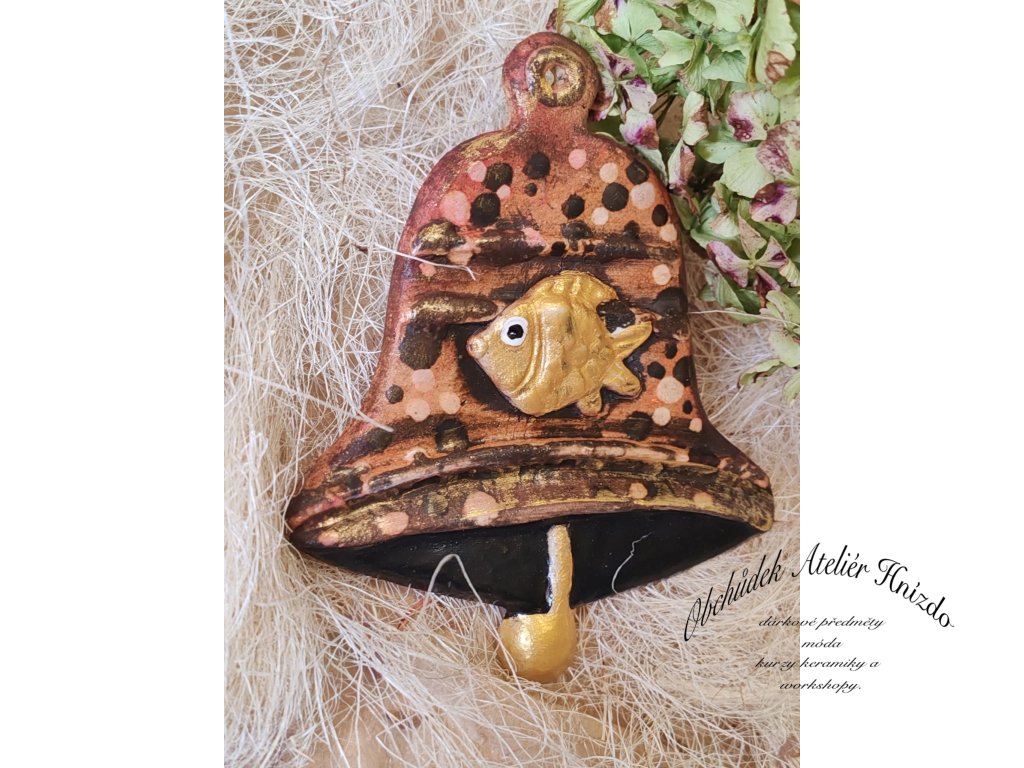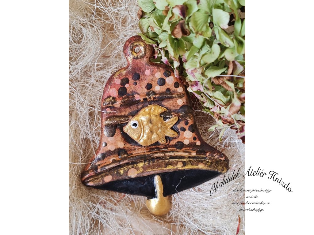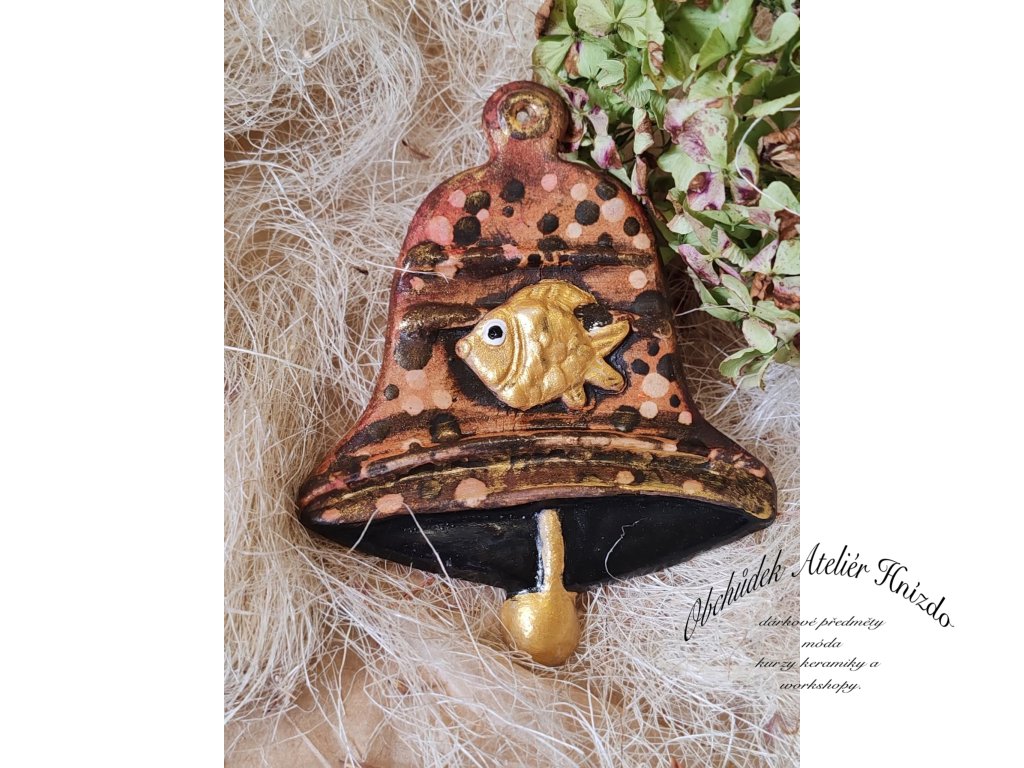 Originální ručně vyráběný keramický zvoneček, který je určený k zavěšení na zeď. Pálený při vysoké teplotě 1200 °C, zdobený reliéfním dekorem a malovaný oxidem železa, glazurou a barvami Darwi. Každý kousek je jedinečný a přináší do interiéru i exteriéru nádech ruční práce a originality.