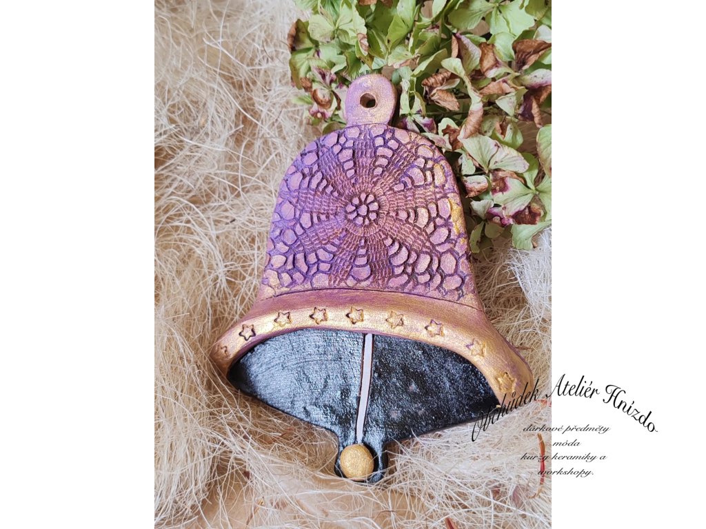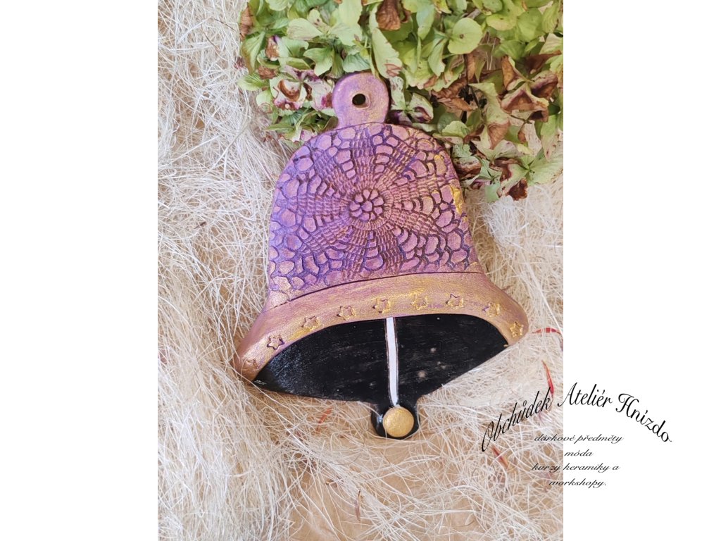 Originální ručně vyráběný keramický zvoneček, který je určený k zavěšení na zeď. Pálený při vysoké teplotě 1200 °C, zdobený reliéfním dekorem a malovaný oxidem železa, glazurou a barvami Darwi. Každý kousek je jedinečný a přináší do interiéru i exteriéru nádech ruční práce a originality.