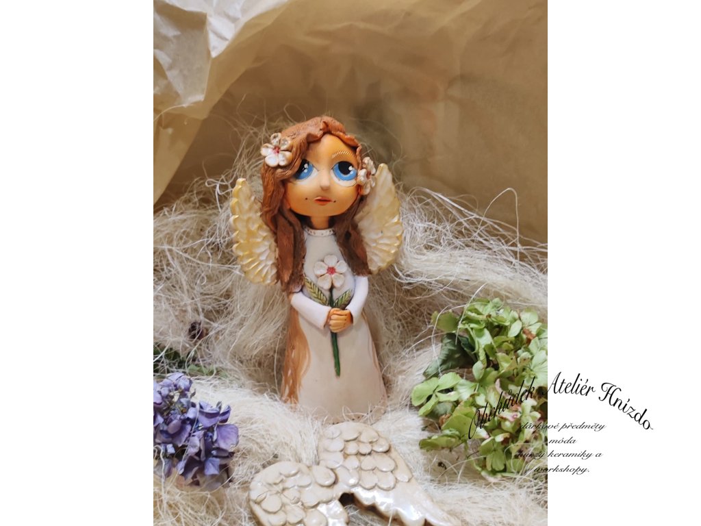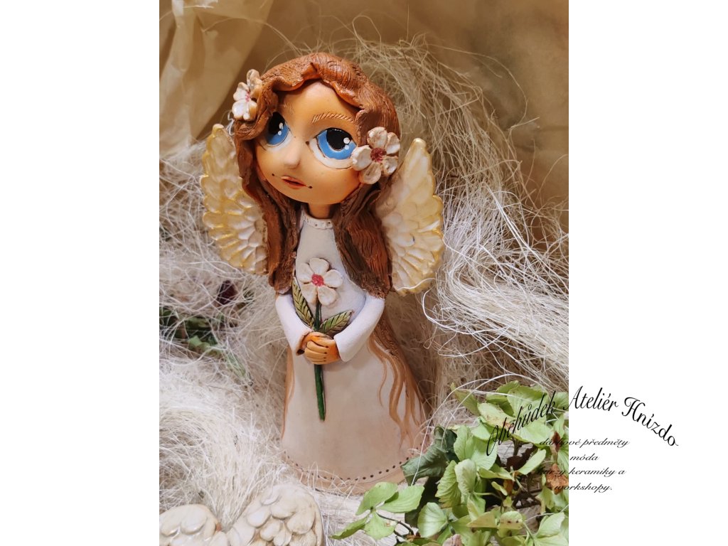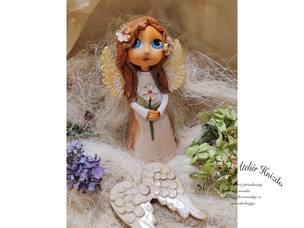 Ručně modelovaný keramický anděl z Ateliéru Hnízdo, autorský výrobek Romany Laštovičkové.