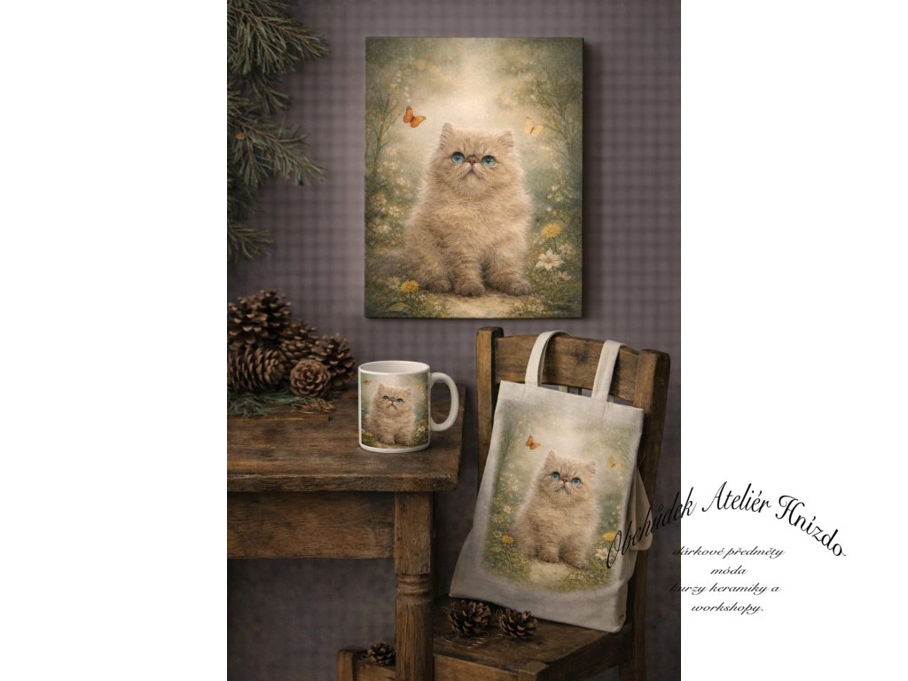 Motiv koťátka a motýlka navozuje pocit bezpečí a harmonie. Obraz je laděn do teplých tónů a hodí se do interiéru, dětského pokoje nebo jako něžný dárek.