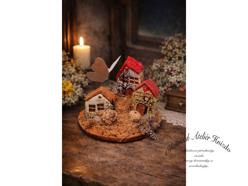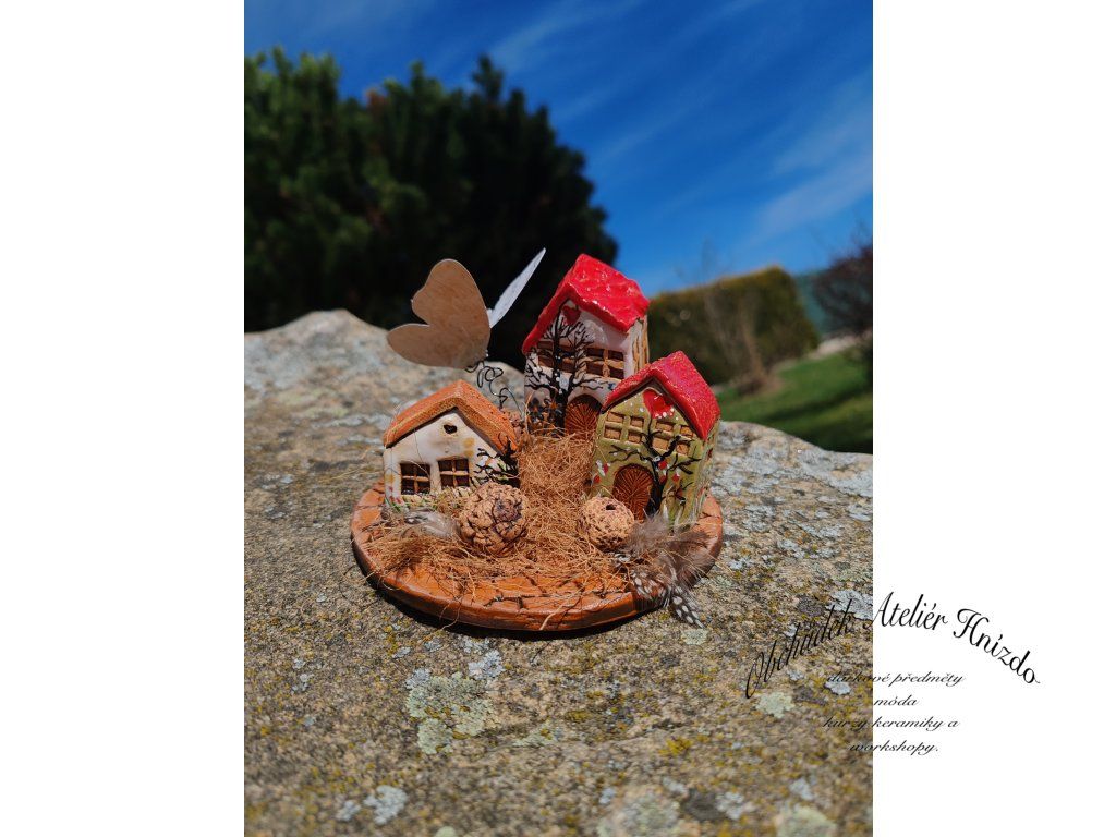 Tři domečky jako z pohádky a tichý motýlek, který kolem nich poletuje.