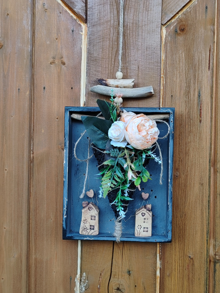 Dřevěná krabička, drátěné srdce, keramické domky, umělé květy.