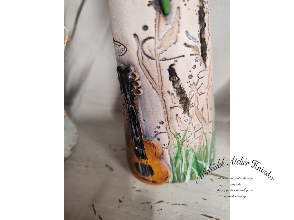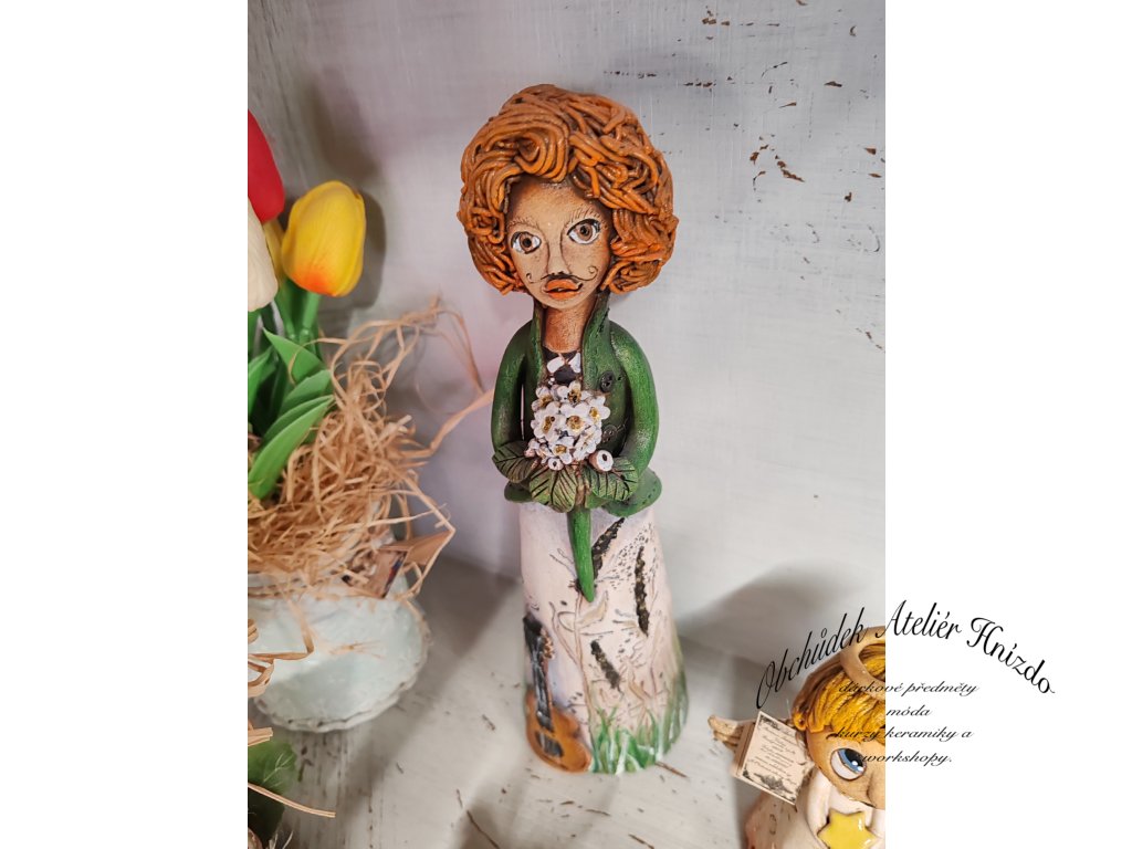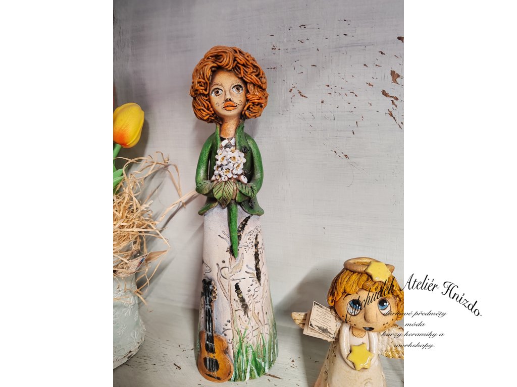 Ručně vyráběná autorská keramická dekorace – pán hudebník, vytvořená s láskou v mém ateliéru. Elegantní postava s jemným výrazem, kudrnatými vlasy a hudebním nástrojem působí poeticky a klidně, jako by si právě broukal tichou melodii. Dekorace vnese do interiéru atmosféru hudby, tvořivosti a příběhu.