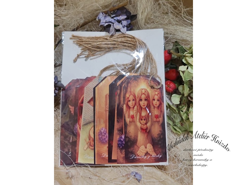 Sada 12 elegantních visaček na dárky z prémiového papíru s vyšší gramáží, zdobených autorskými ilustracemi Romany Laštovičkové.