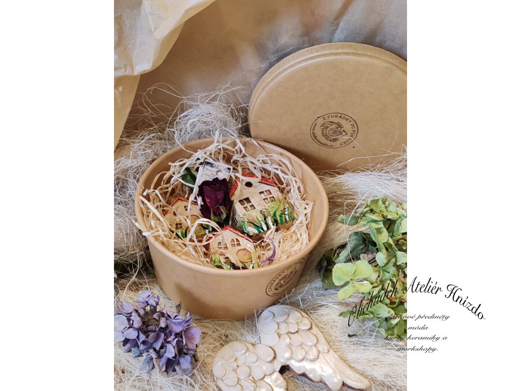 Originální sada tří keramických domečků od Romany Laštovičkové, pečlivě uložená v kulaté dárkové krabičce. Každý domeček je ručně modelovaný, pálený na vysokou teplotu (1200 °C), dekorovaný glazurami z Roudnice, oxidem železa a domalovaný barvami Darwi. Díky tomu jsou domečky pevné, odolné a mohou zdobit interiér i venkovní prostor – snesou déšť i mráz.