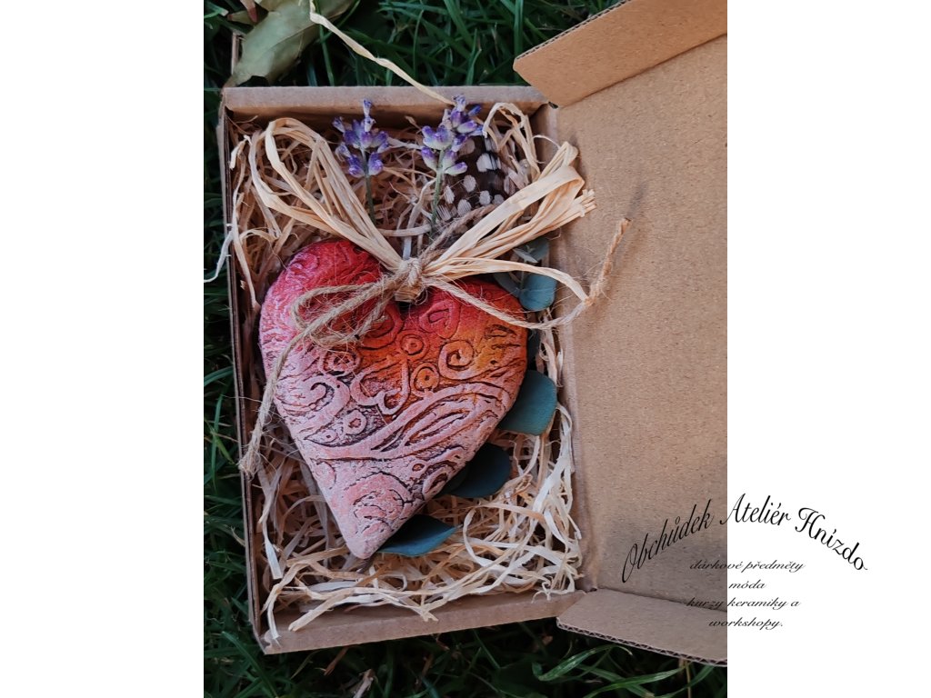 Ručně modelované keramické srdíčko o velikosti cca 8 × 7 cm je vyrobené ze dvou půlek, duté a díky tomu lehké. Každý kus je originál – dekorovaný oxidem železa (Buchlerr Praha), akrylovými barvami Darwi a vytvořený z hlíny The Jaroměř – Svída.