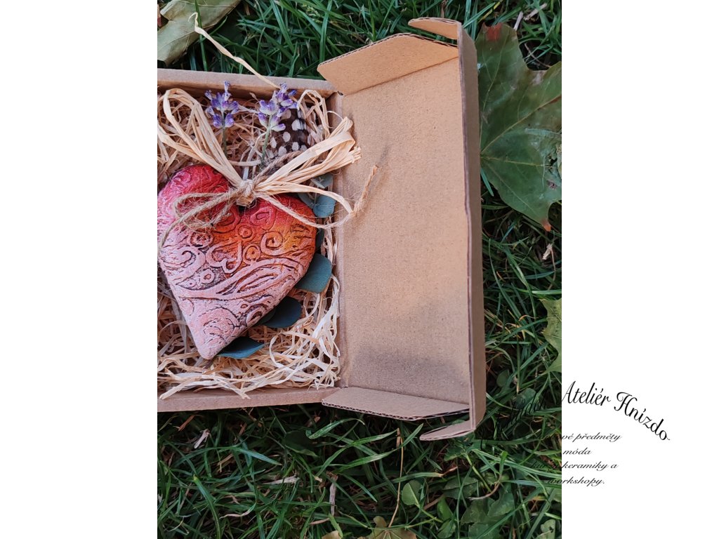 Srdíčko je uloženo v dárkové krabičce (13 × 8 × 3 cm) vyplněné dřevitou vlnou, sušenými a živými květy. Krabička je svázaná provázkem a doplněná přírodními detaily, takže je připravena rovnou k darování.