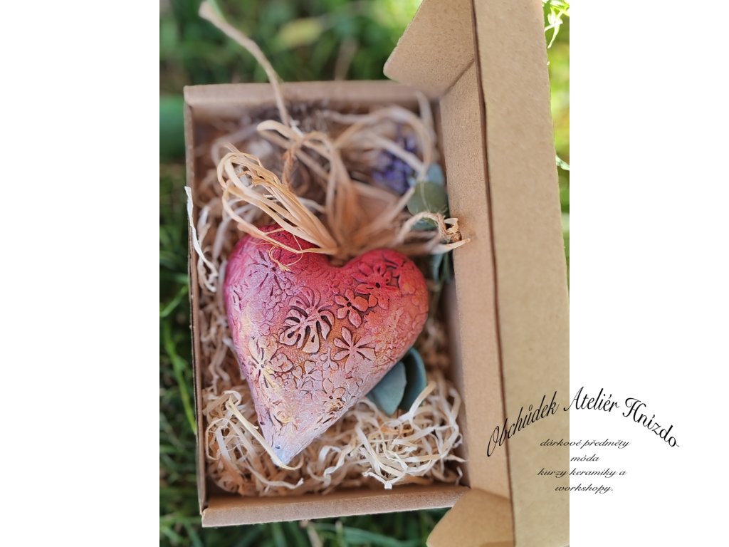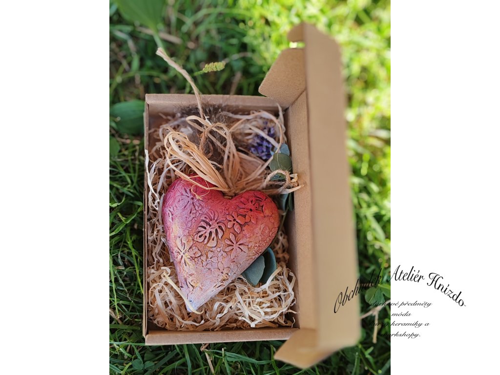 Srdíčko je uloženo v dárkové krabičce (13 × 8 × 3 cm) vyplněné dřevitou vlnou, sušenými a živými květy. Krabička je svázaná provázkem a doplněná přírodními detaily, takže je připravena rovnou k darování.