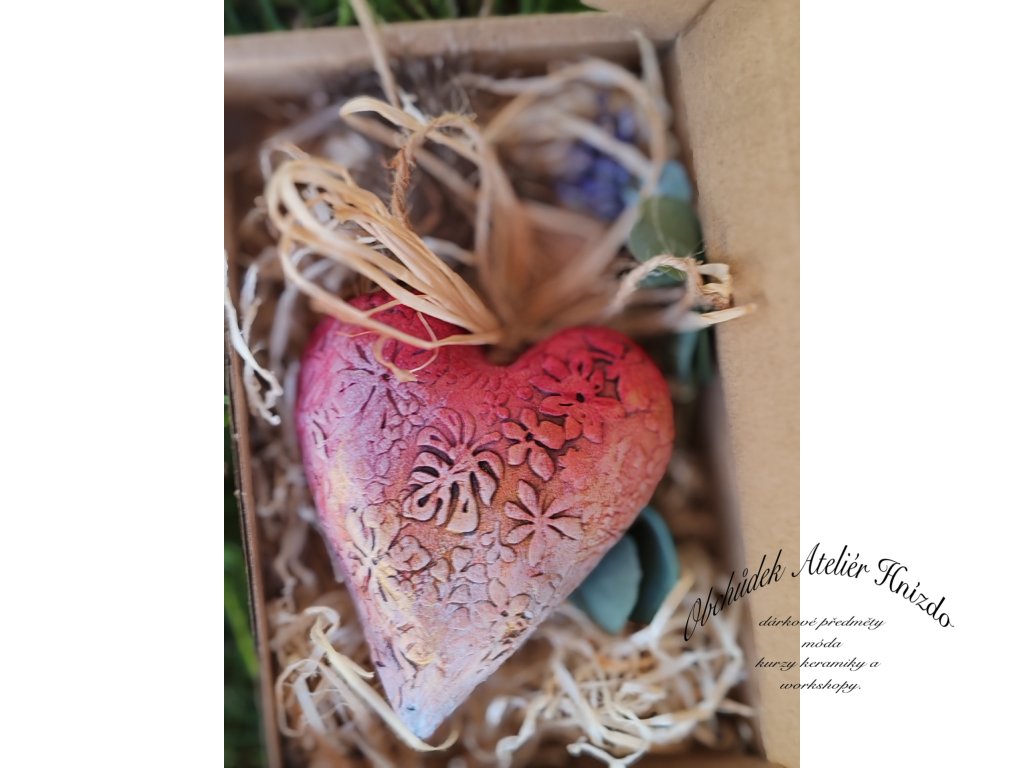 Ručně modelované keramické srdíčko o velikosti cca 8 × 7 cm je vyrobené ze dvou půlek, duté a díky tomu lehké. Každý kus je originál – dekorovaný oxidem železa (Buchlerr Praha), akrylovými barvami Darwi a vytvořený z hlíny The Jaroměř – Svída.