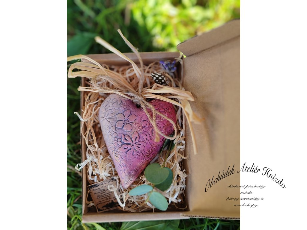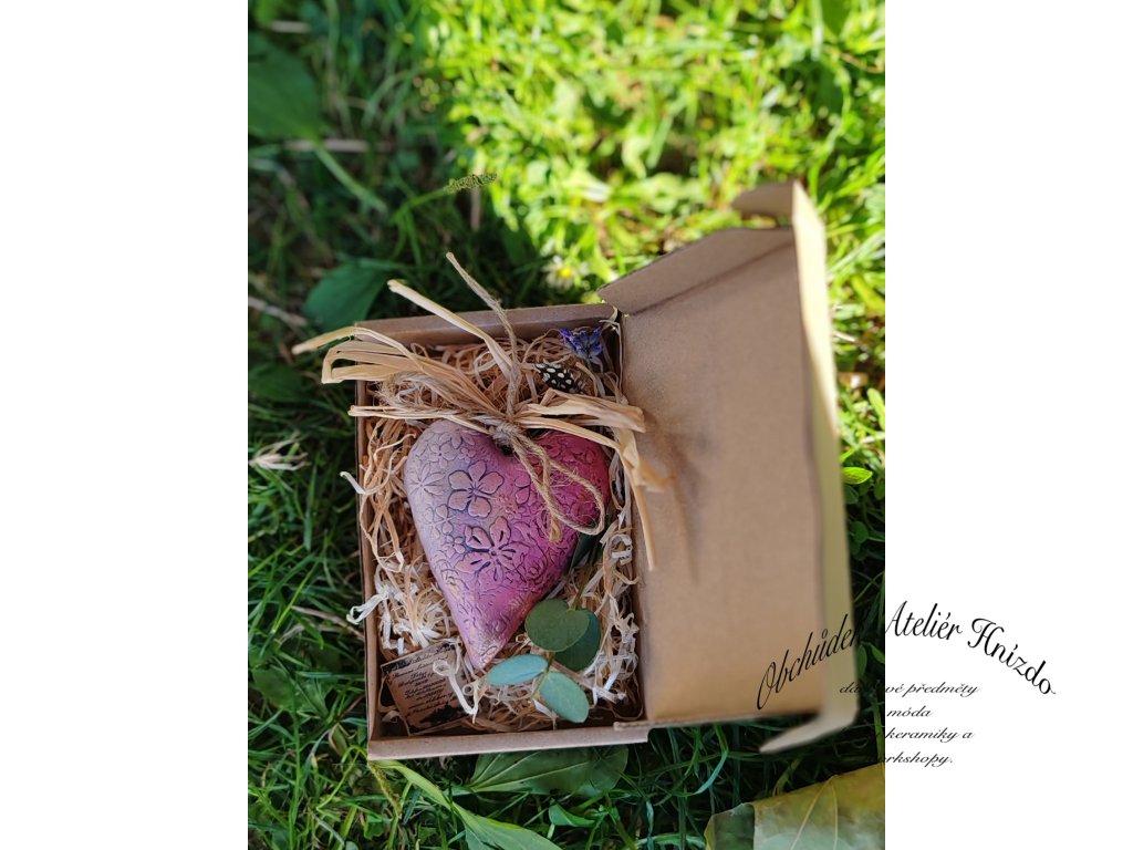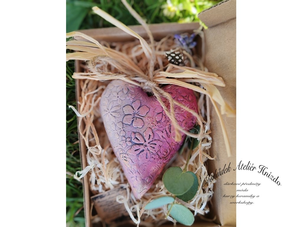 Ručně modelované keramické srdíčko o velikosti cca 8 × 7 cm je vyrobené ze dvou půlek, duté a díky tomu lehké. Každý kus je originál – dekorovaný oxidem železa (Buchlerr Praha), akrylovými barvami Darwi a vytvořený z hlíny The Jaroměř – Svída.