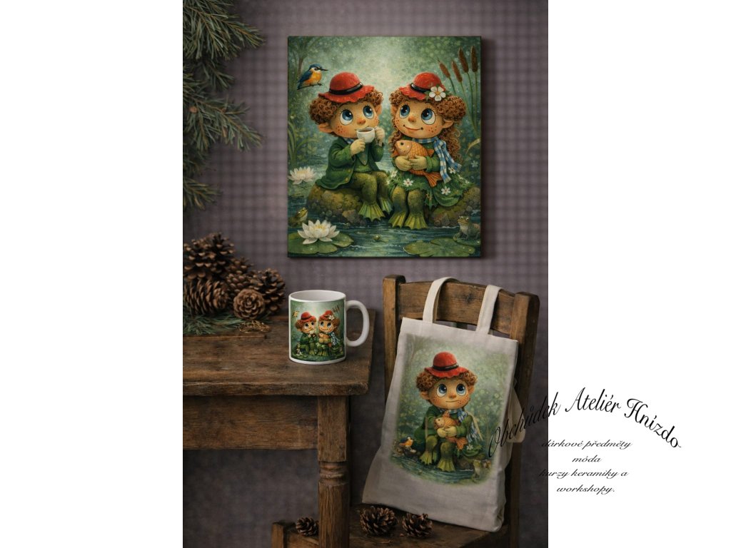 Motiv vodníčků u tůňky navozuje pocit bezpečí a harmonie. Obraz je laděn do teplých tónů a hodí se do interiéru, dětského pokoje nebo jako něžný dárek.
