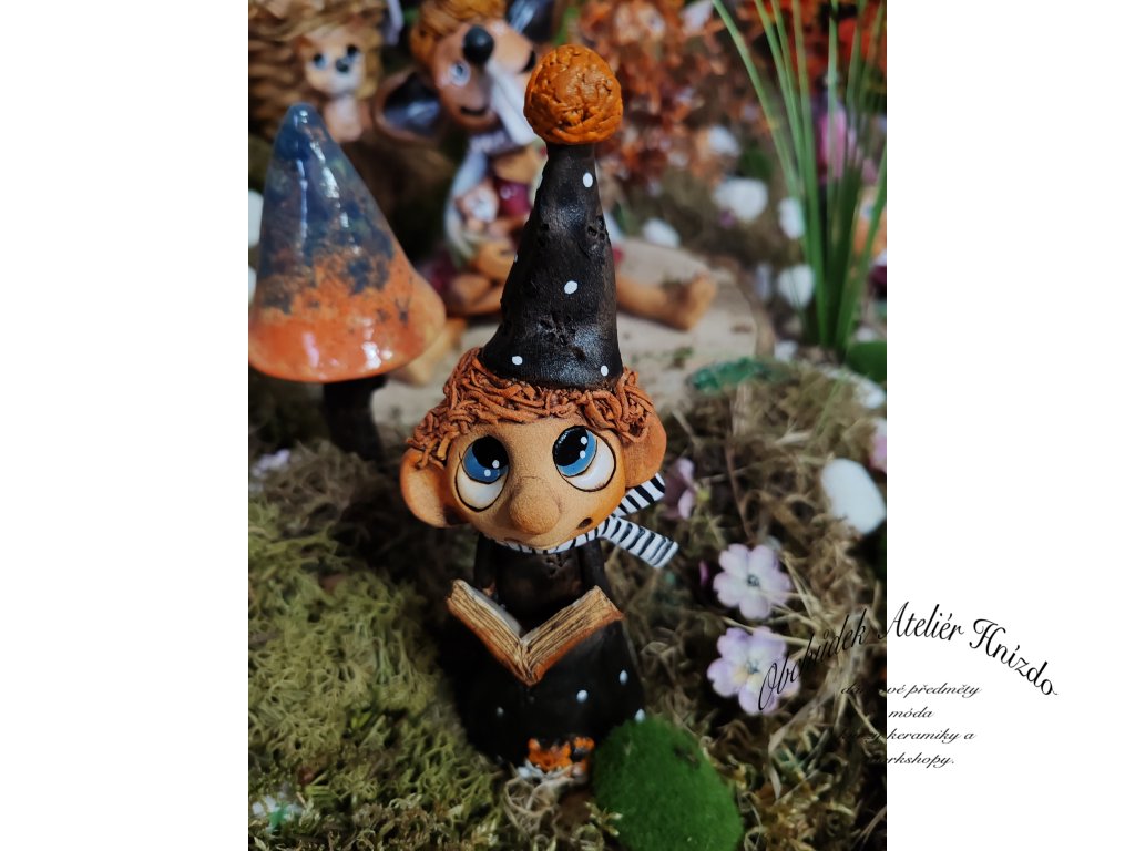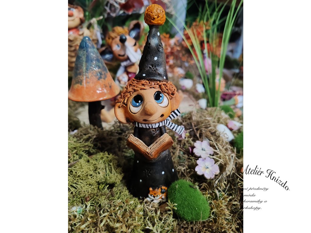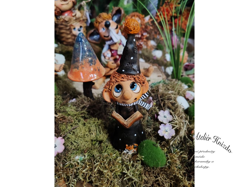 Zasněný vypravěč s vysokou špičatou čepicí, knihou plnou kouzel a pruhovanou šálou, která mu dodává osobitý šmrnc. U nohou mu tiše sedí malý liščí kamarád, věrný strážce všech tajemství.