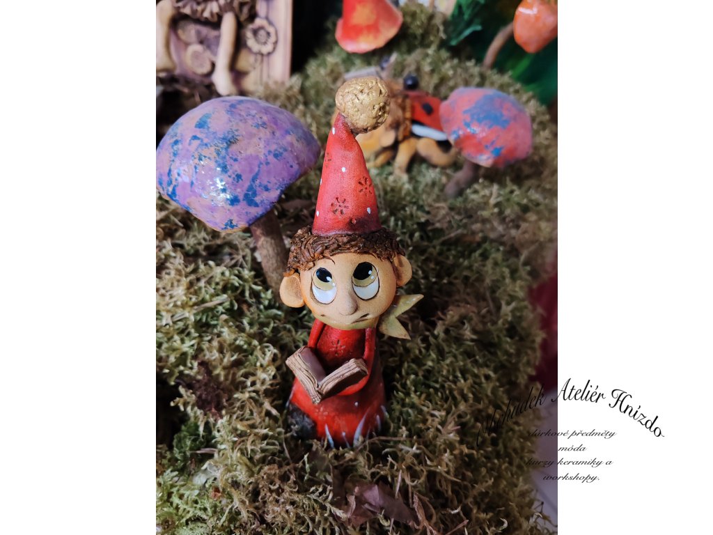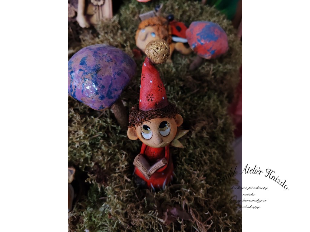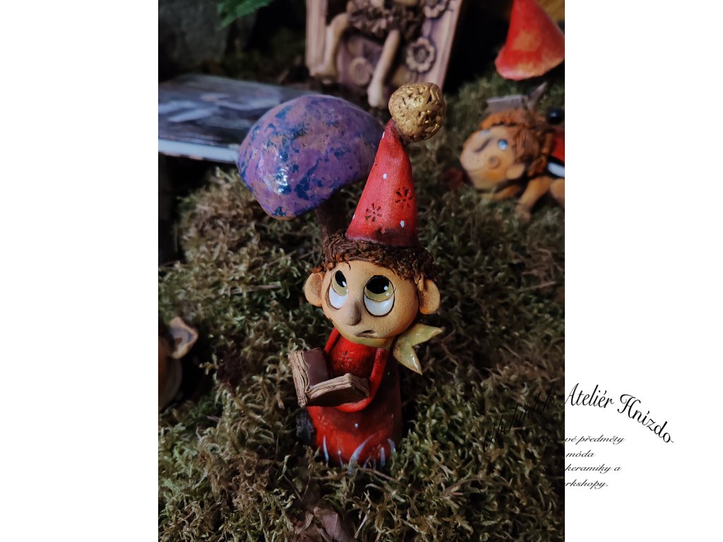Kouzelná bytost v červeném šatu s vysokou špičatou čepicí a knihou plnou tajemství. Její pohled je jemný a zasněný, jako by právě šeptala nové zaklínadlo do stránek staré knihy.